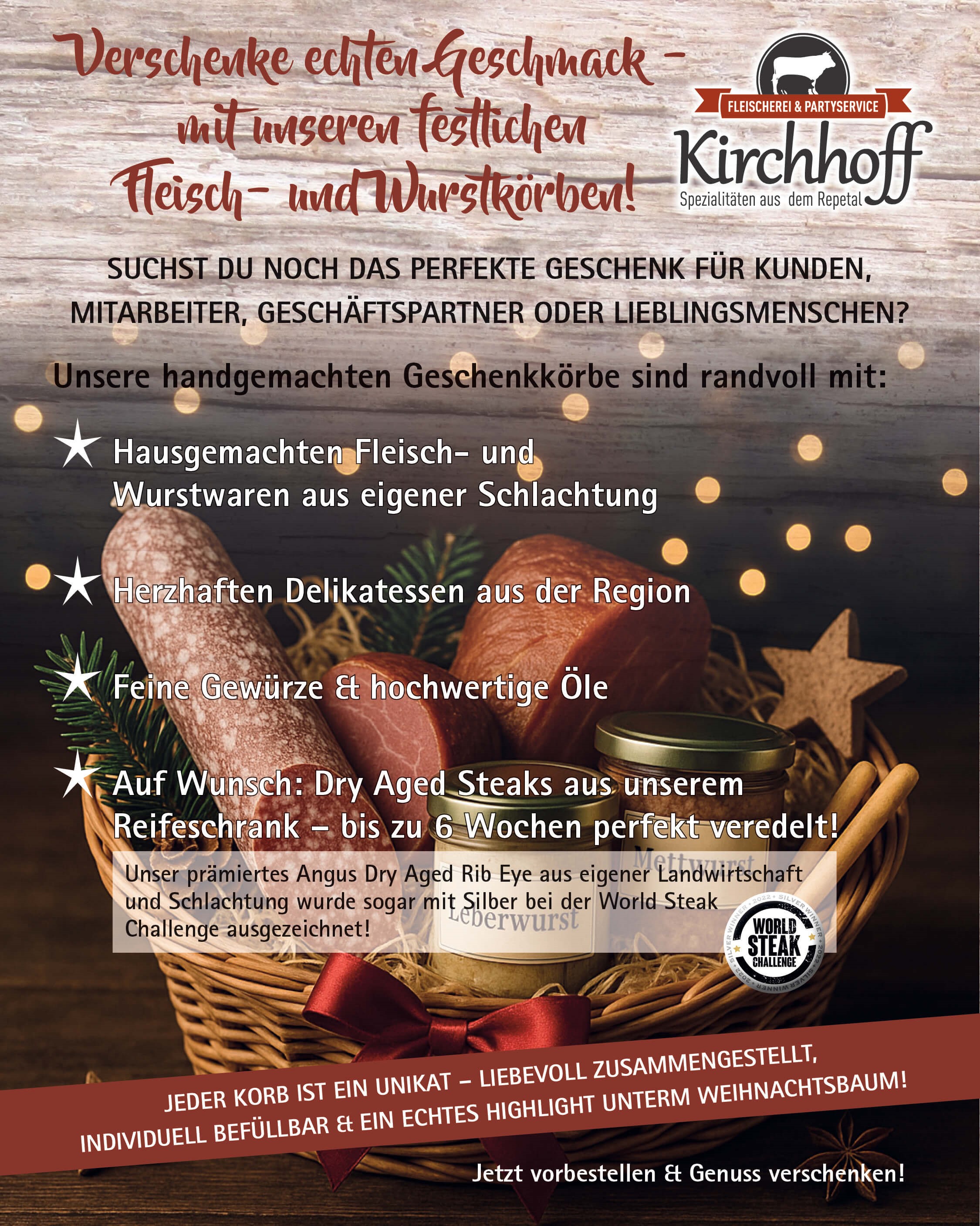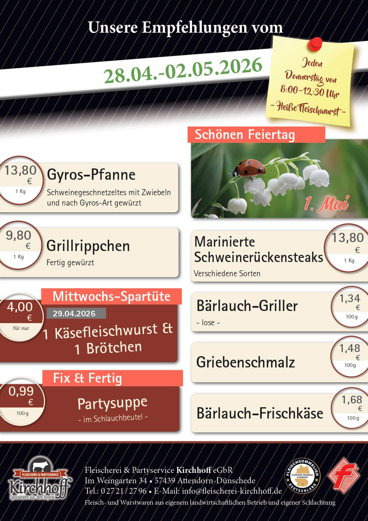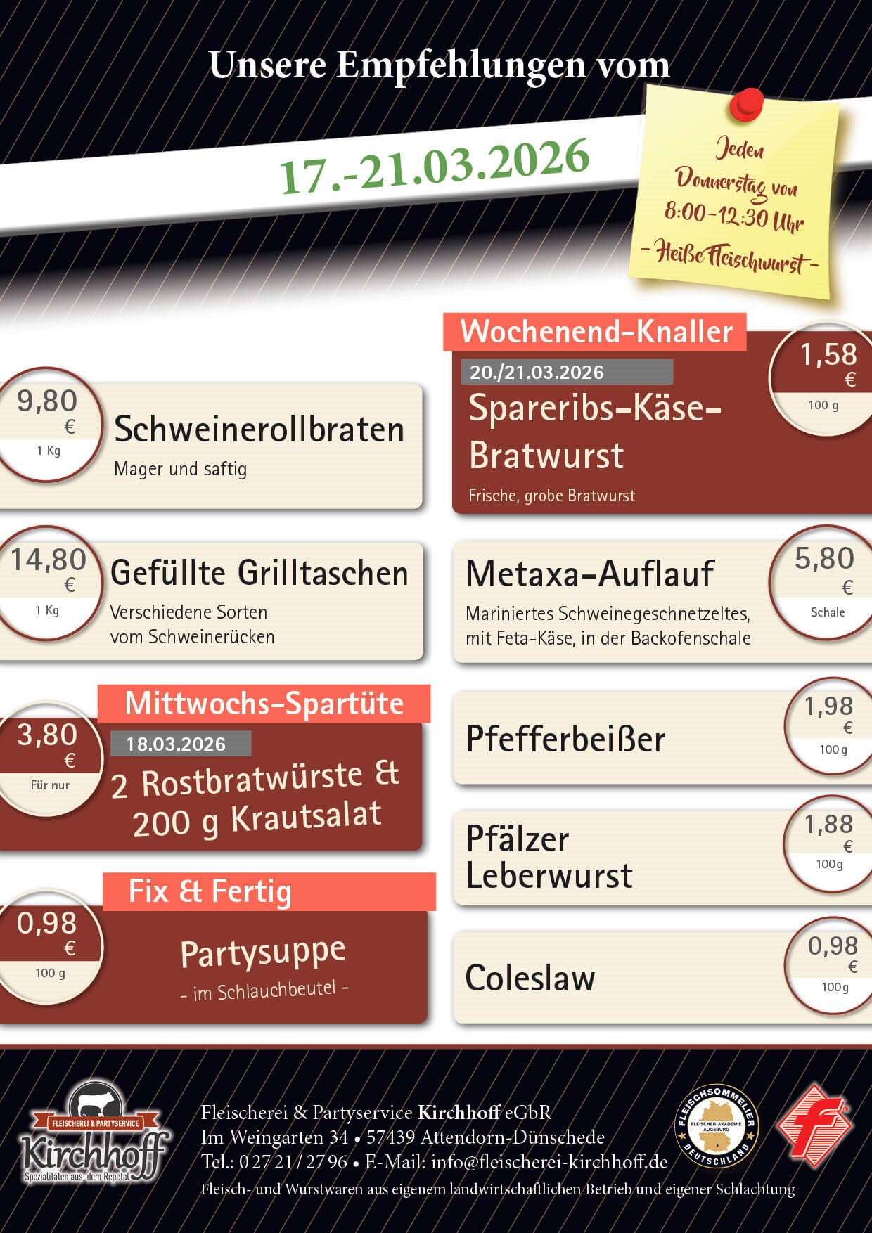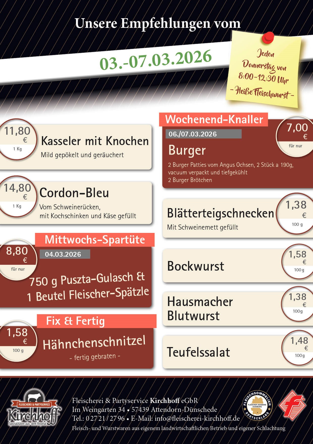 Willkommen bei der Fleischerei & Partyservice Kirchhoff in Dünschede