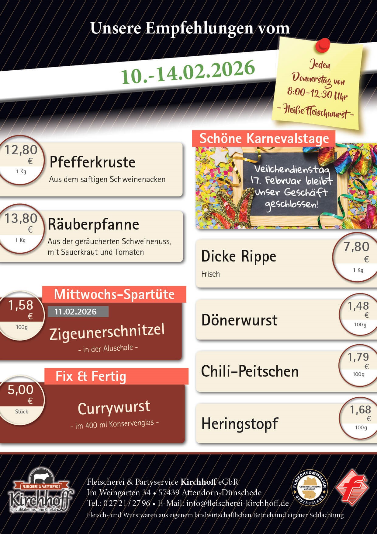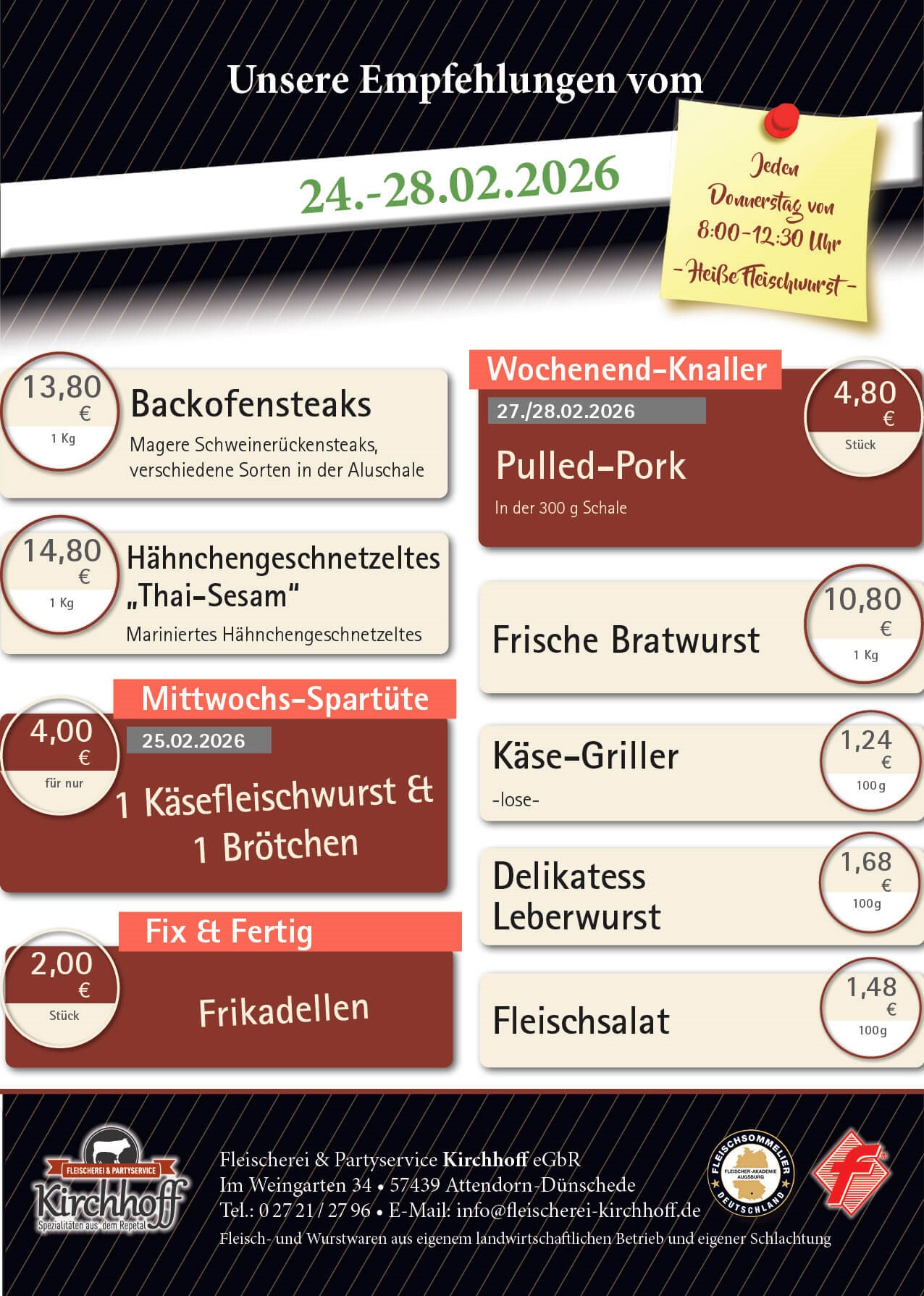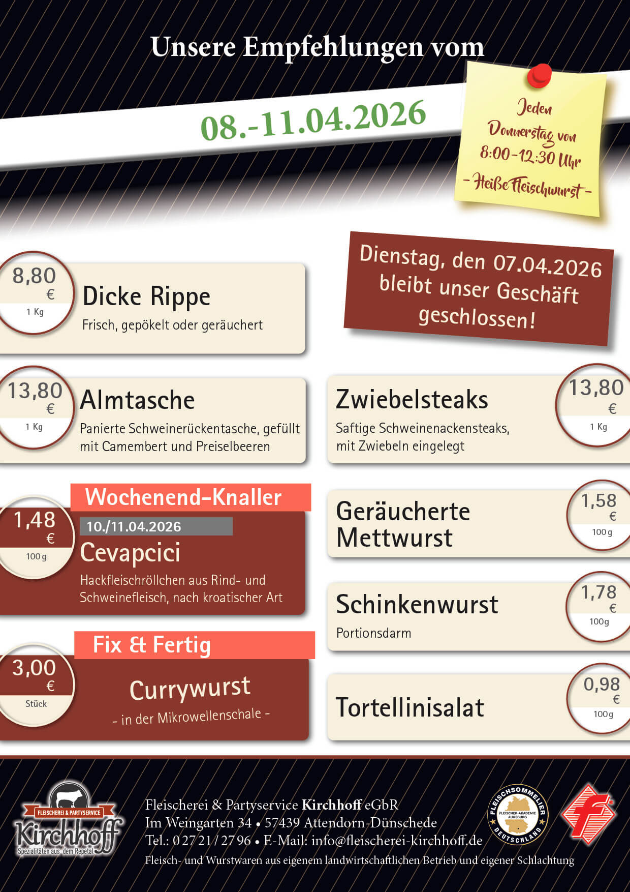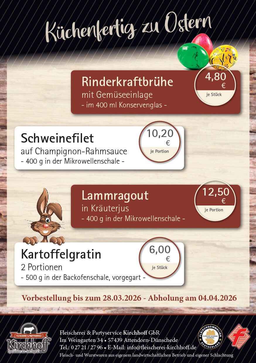 Willkommen bei der Fleischerei & Partyservice Kirchhoff in Dünschede